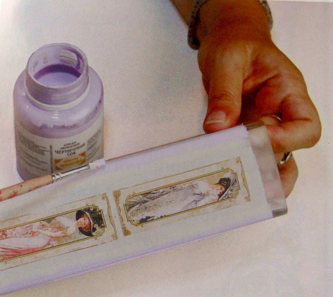 Располагаем на вазе наши декупажные мотивы. Если у вас карта, то перед приклеиванием её обязательно замачиваем, смазываем клеем поверхность и разглаживаем кистью или руками, выгоняя излишки клея и пузырьки воздуха из под карты.